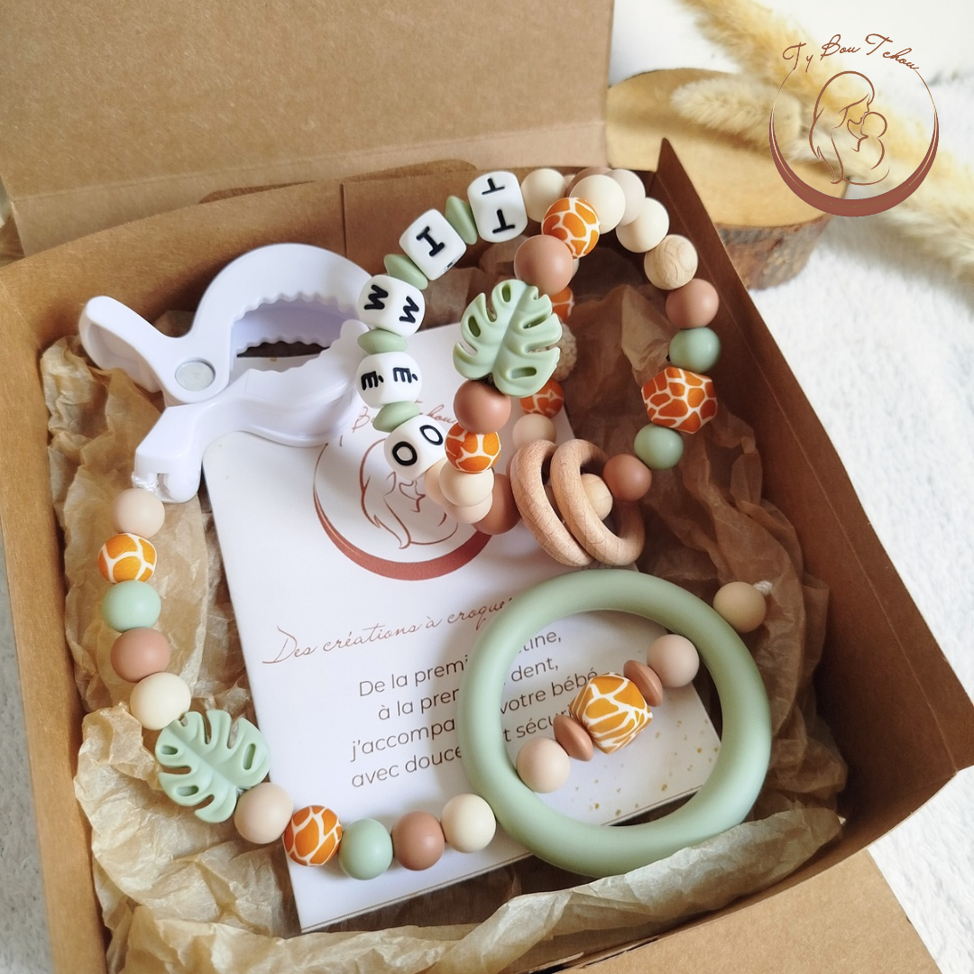 Personnalisez vous-même la balle de préhension et le jouet à suspendre qui composeront votre coffret !
