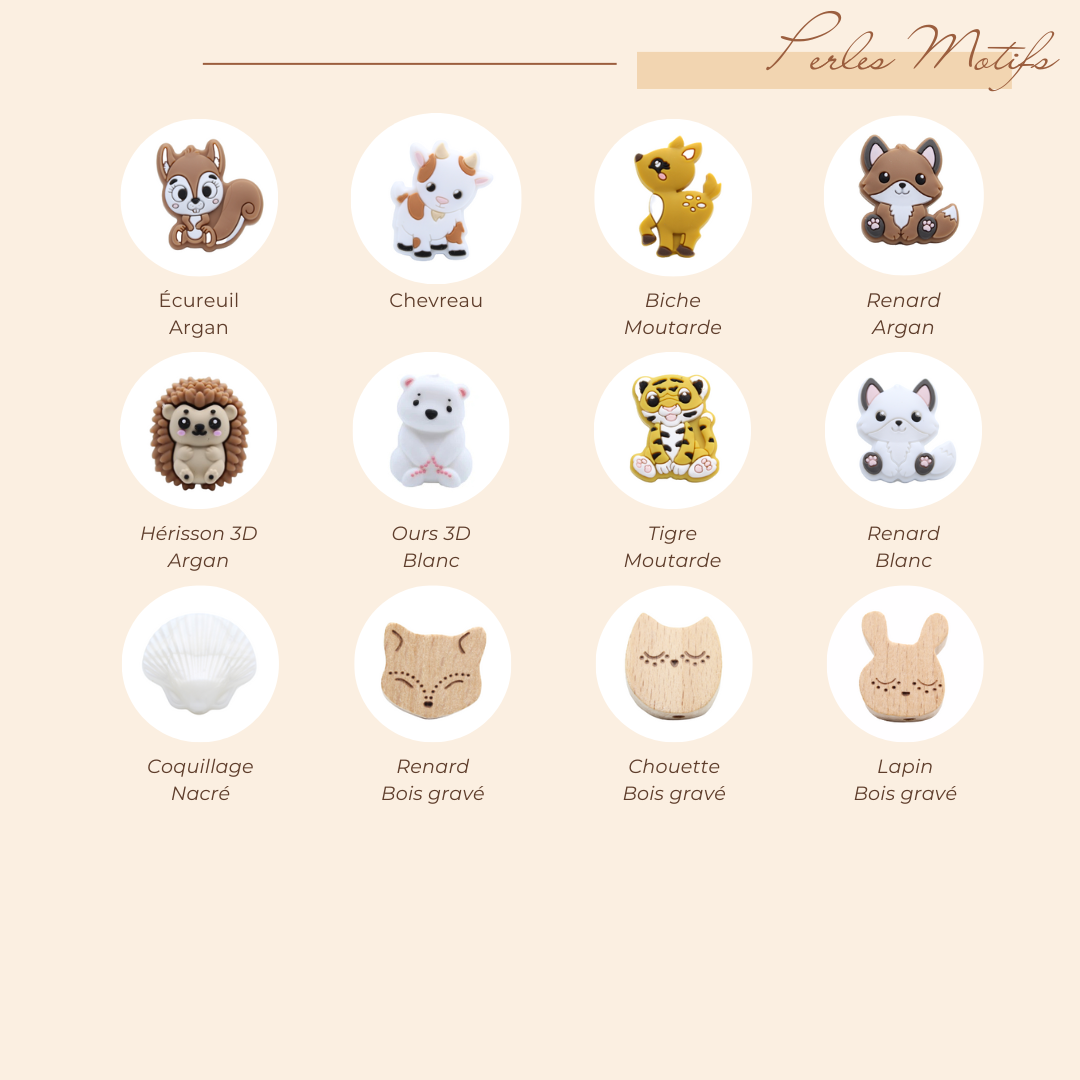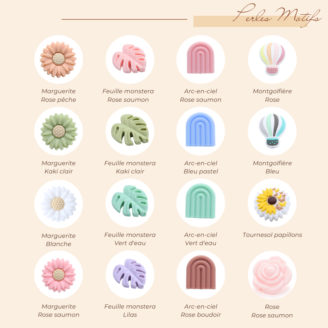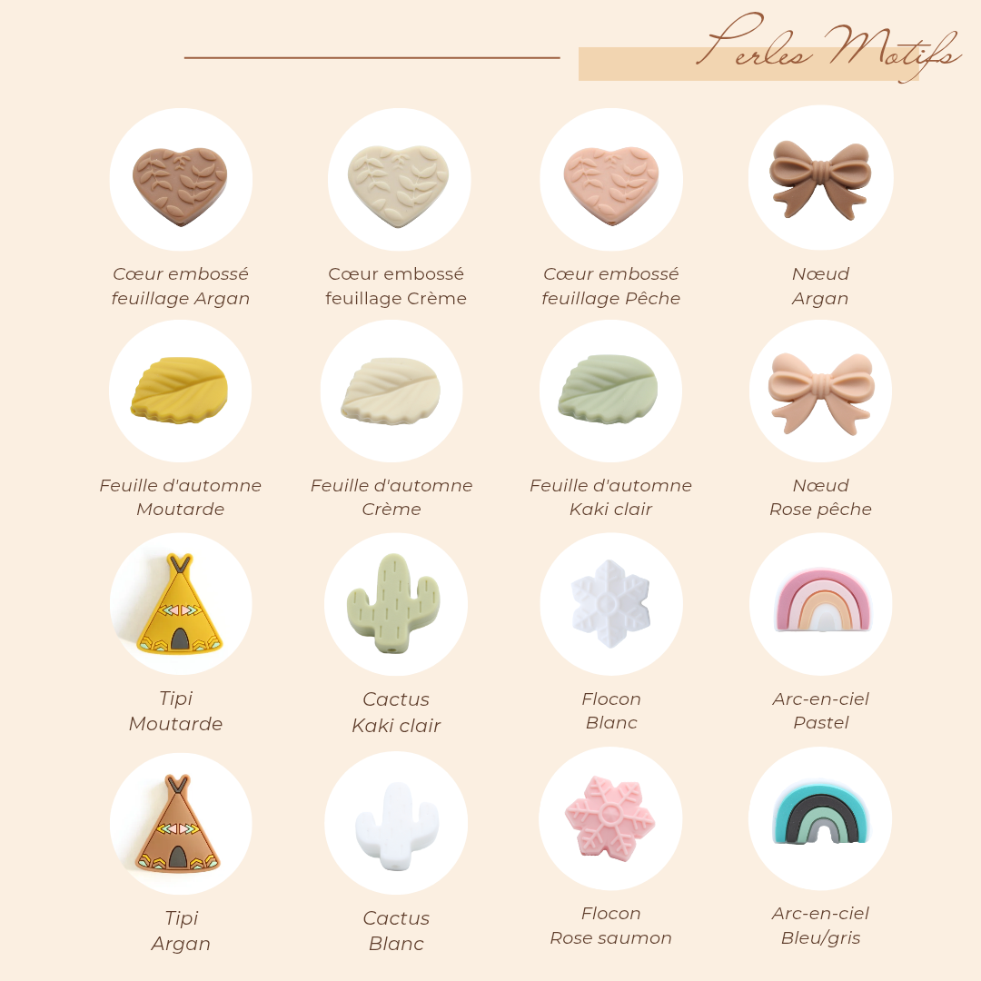 | Matériaux | – Les perles, clips et anneaux en silicone alimentaire sont exempts de BPA, phtalates, cadmium, plomb ou autres métaux et solvants, conformément à la norme NF EN 71-3. |